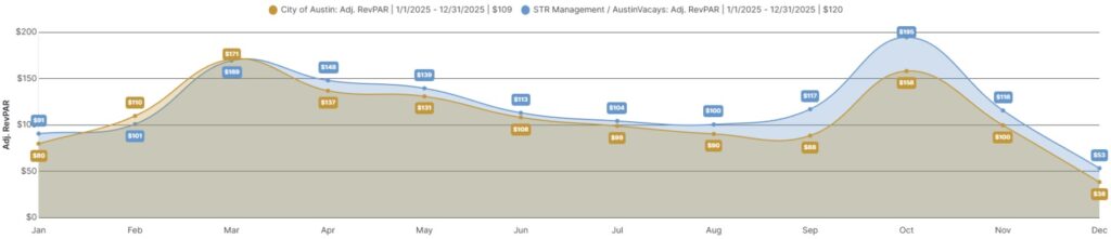 - We outperform the competition. As a whole we have outperformed other City of Austin professional vacation rental managers by more than 10% in revenue per available room (RevPAR) this year and by as much as 23% at times.